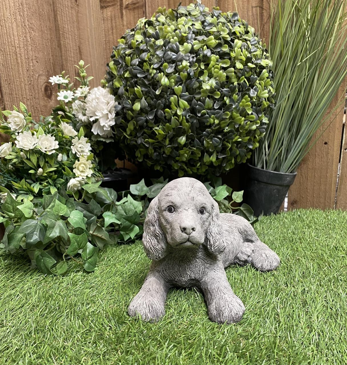 The most fantastic, stone cast model of a lying spaniel puppy, featuring lovely big eyes. A breathtakingly realistic and detailed statue, suitable as an indoor or outdoor ornament or even as a headstone for a beloved animal memorial. Stone cast and absolutely solid, this piece is a beautiful gift, built to last a lifetime.