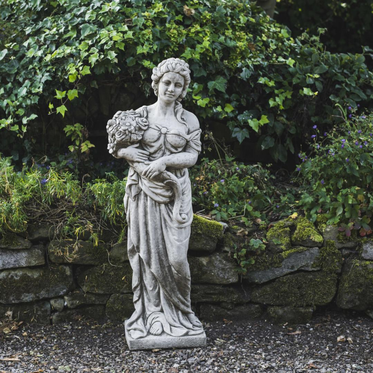 Superbly cast, beautiful statue featuring a woman with a bunch of flowers, a folded Roman style dress and exceptionally detailed facial expressions. A stunning piece of garden art that can be installed on a pedestal in conservatories, gardens, reception areas or any other open space. Free standing on an integral plinth but can be installed on a pedestal for a better display, this statue is truly a classical piece that will certainly not disappoint and would look fantastic in any environment. This female statue represents absolutely outstanding value for such a heavy, solid classic sculpture.