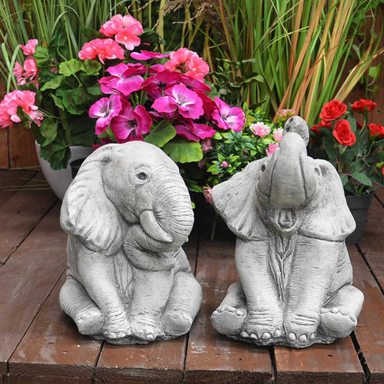 Two absolutely adorable garden statues of playful elephants, one with it's trunk up and the other with it's trunk down. These exceptionally detailed and sweet garden ornaments are the perfect addition to any animal-lover's garden and will add a charming touch wherever it is placed! These products are finished in a natural effect to be lifelike.
