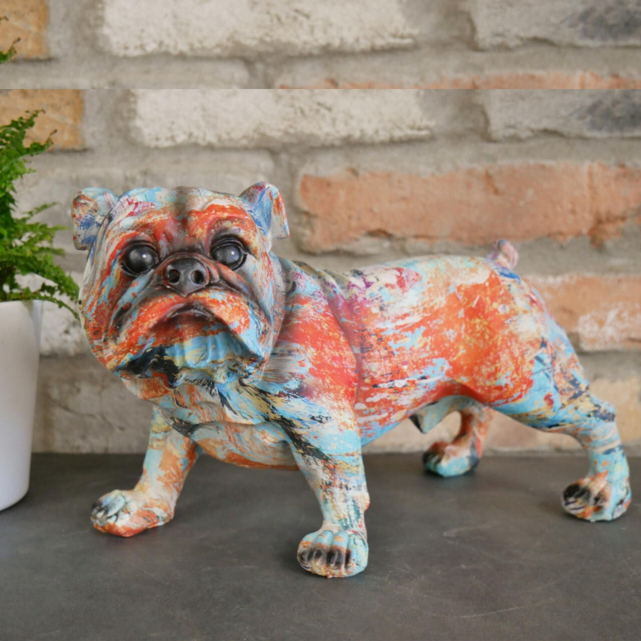 A fabulous bright coloured 'Graffiti Art' standing British Bulldog figurine would be a delighted resident in your indoor or outdoor space. Hand cast and hand finished from high quality resin to the highest of standards. A unique and quirky item that is sure to stand out in your home. Style up your room with these cute colourful dog ornament and dot them around your home!
